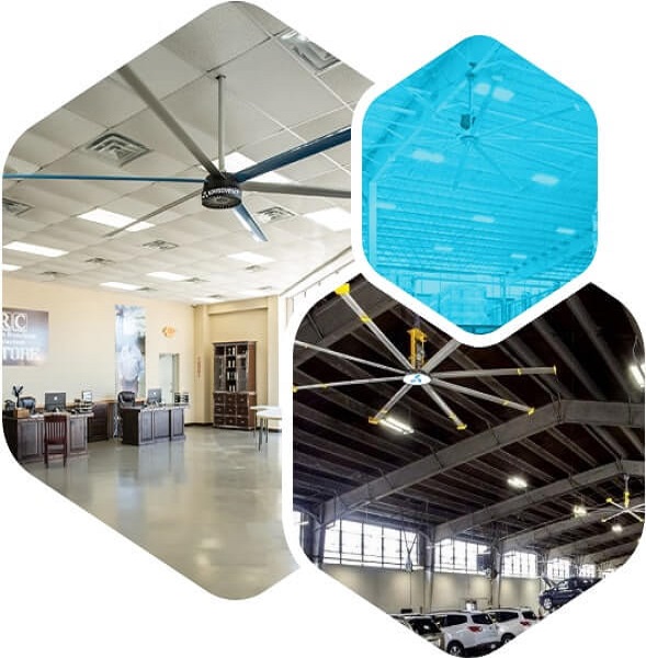 An HVLS fan is a high-volume, low-speed ceiling fan greater than seven feet in diameter. Its large size stirs up and moves enormous amounts of air in all directions. The increased air circulation replaces hot, humid air with drier air.